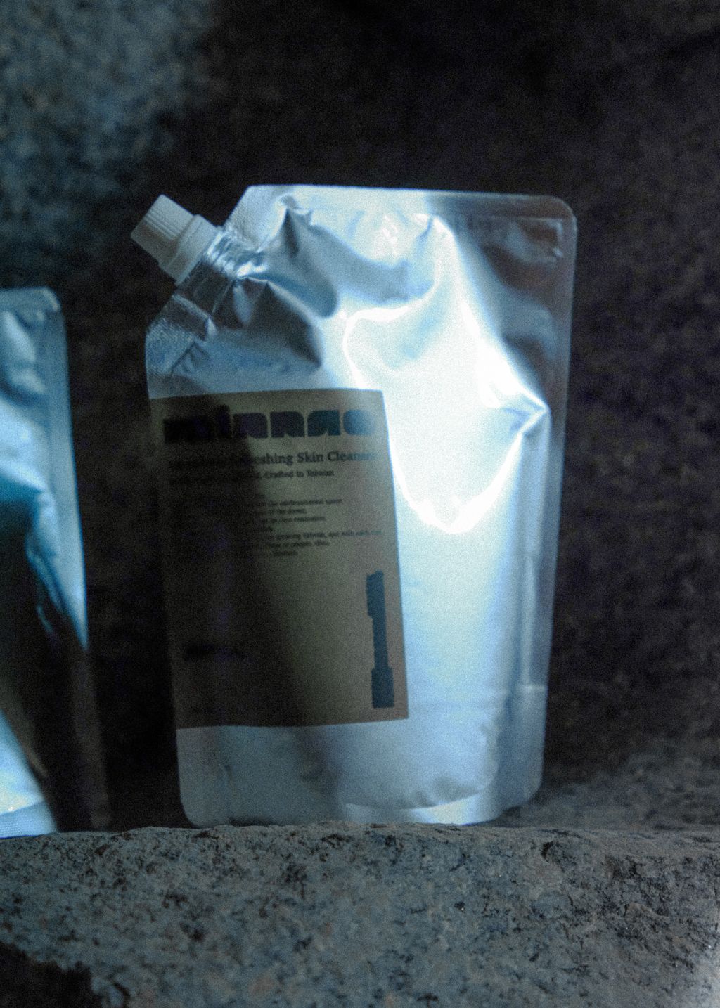 選用玻璃為包裝材質,委託春池玻璃以半手工吹製製作,瓶身上的氣泡、玻璃的流動、字體的漸強漸弱,那些別人眼中的瑕疵,詮釋了我們對生活的想像,不求完美無瑕,卻要活出屬於自己的痕跡。玻璃是一種可以百分之百完全回收的材質,除了減少資源上的浪費,我們也著重在瓶身設計,希望增強重複利用的驅力,無論是再填裝、花器擺飾或任何形式的保留下瓶身,都是一種友善。